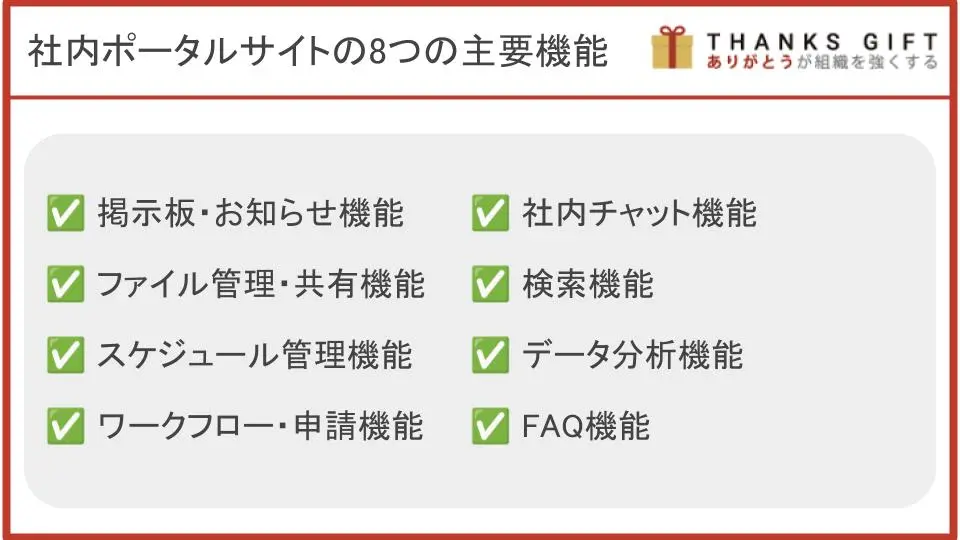 社内ポータルには、業務効率化やコミュニケーション促進のためのさまざまな機能が搭載されています。