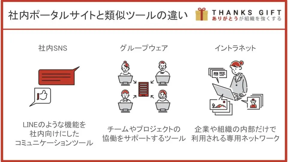 社内ポータルと混同されやすいツールがいくつかあります。それぞれの違いについて紹介します。