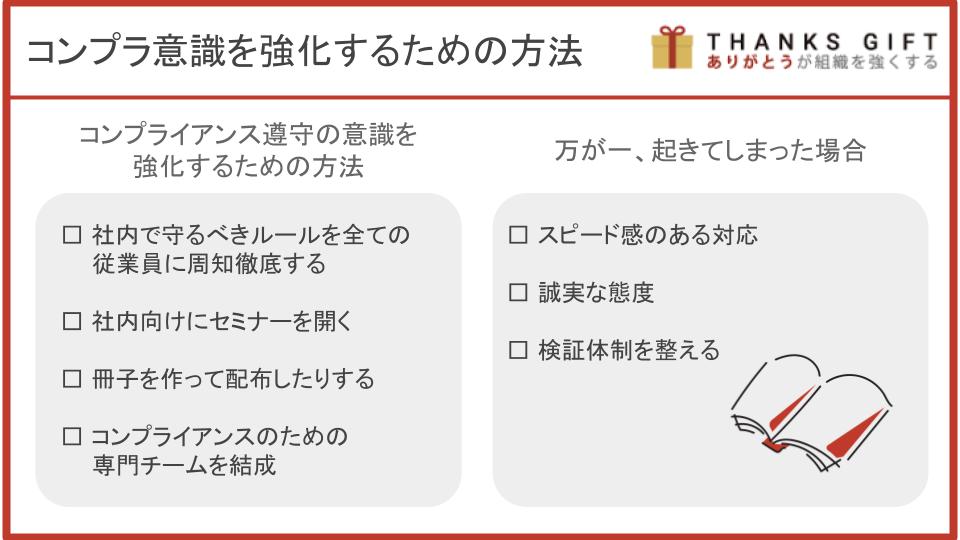社内向けにセミナーを開いたり、冊子を作って配布したりするなどの努力で、大半のコンプライアンス違反が未然に防げるでしょう。