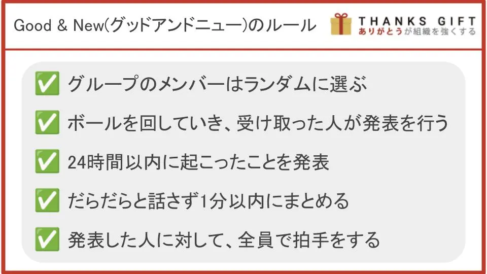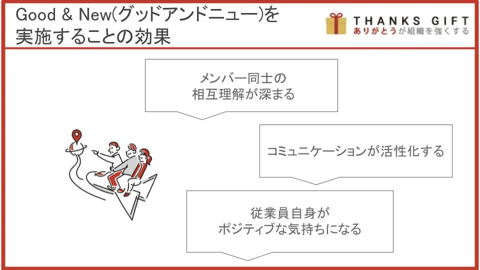 Good & New(グッドアンドニュー)は、部署やチーム内で行うことによって、コミュニケーションが増えたり、メンバー同士の連帯感が生まれたりすると言われています。