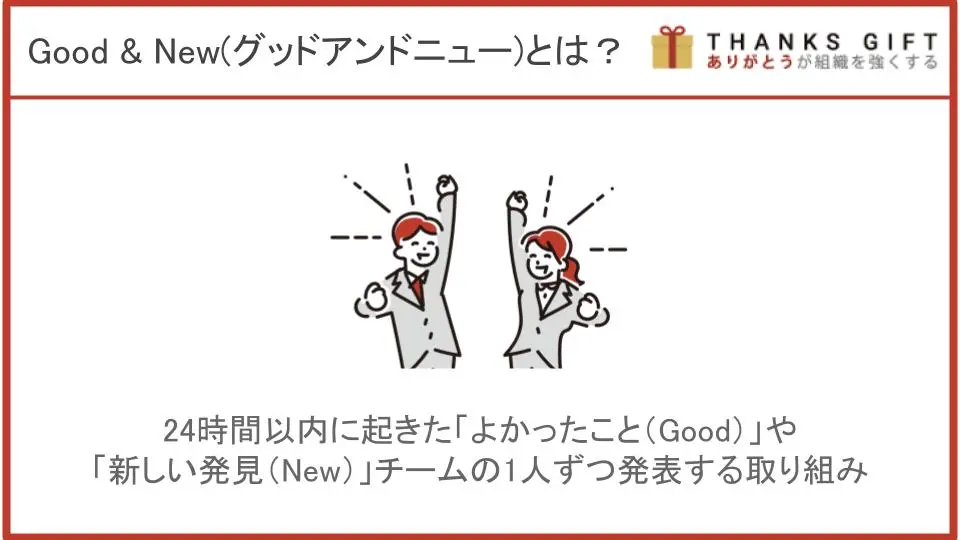 Good&Newとは、24時間以内に起きた「よかったこと(Good)」や「新しい発見(New)」をチームのメンバーが一人ずつ発表し合う取り組みです。 朝礼や定例会議の場で実施する企業が多く、メンバー同士の連帯感やコミュニケーションの活性化を目的として導入されています。