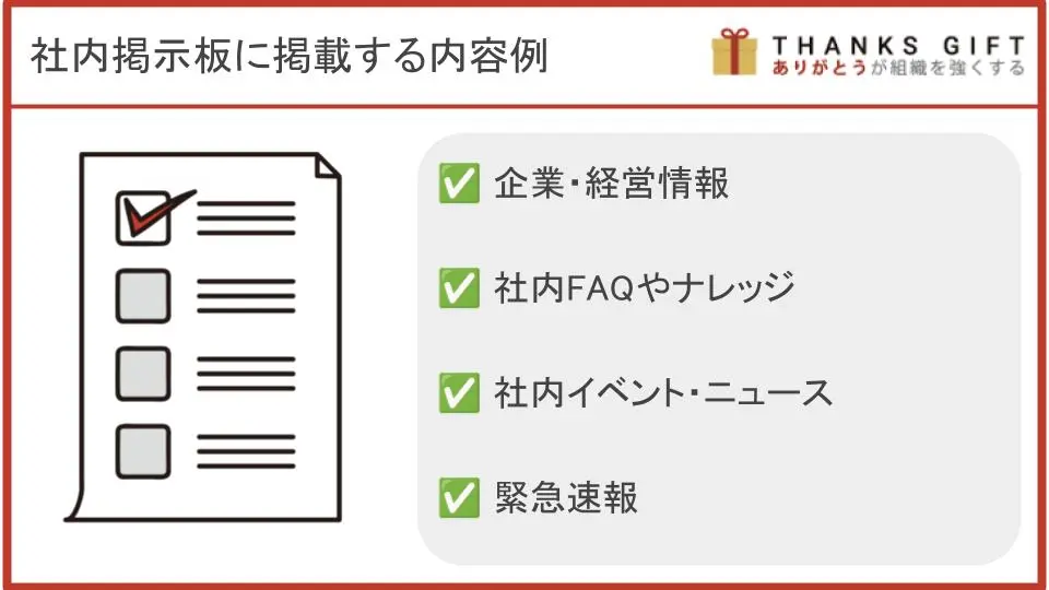 - 掲載内容の代表例は、企業・経営情報、社内FAQやナレッジ、社内イベント・ニュース、緊急速報の4種類