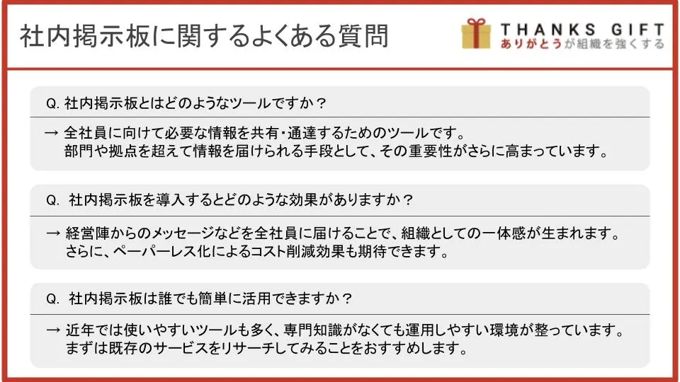 既存ツールを利用して社内掲示板を作成したいと考えている場合は、付加価値の高い『THANKS GIFT』を活用してみてください。