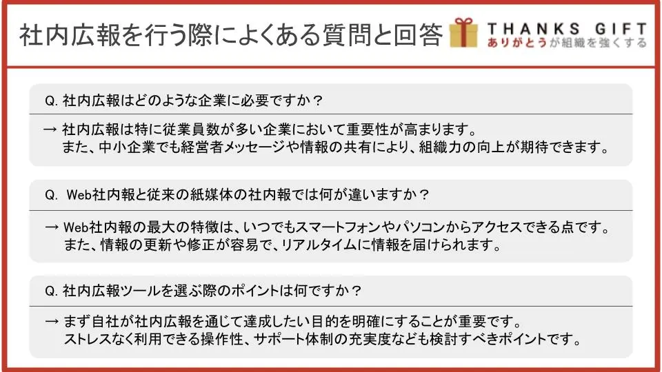 社内広報を行うにあたってよくある質問と回答を紹介します。