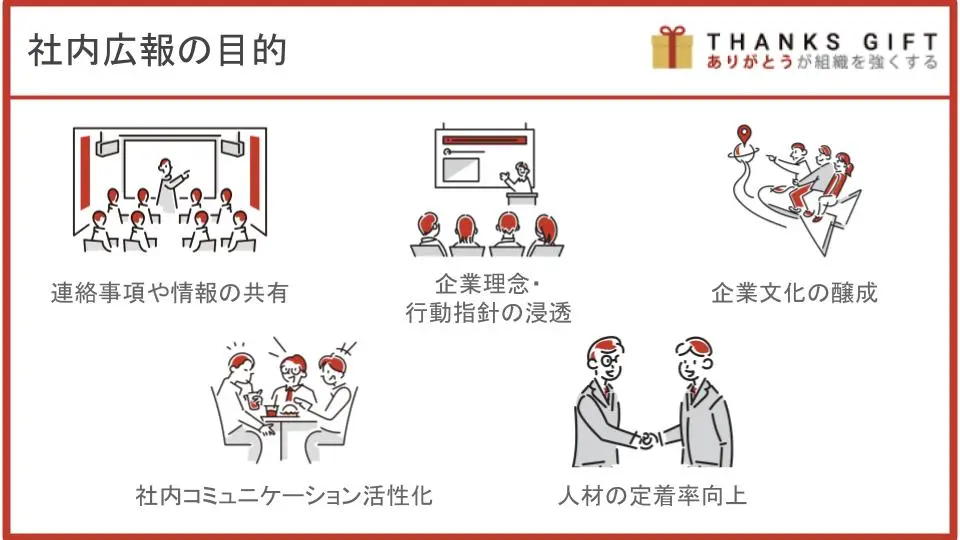 社内広報は、大きく5つの目的を元に行われます。