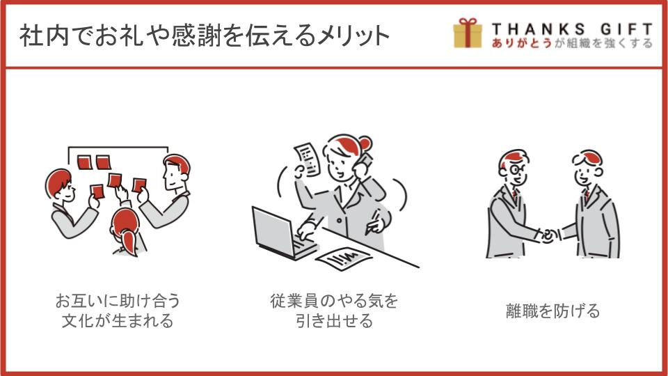 THANKS GIFT(サンクスギフト)は、感謝を贈り合うことで社内コミュニケーションを活性化させ、社内文化を醸成でき組織や社内の生産性向上、エンゲージメント向上に寄与するツールです。