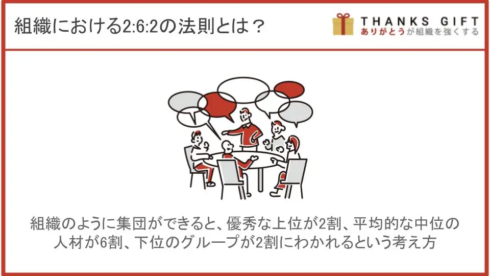 組織のように集団ができると、優秀な上位が2割、平均的な中位の人材が6割、下位のグループが2割にわかれるという考え方です。
