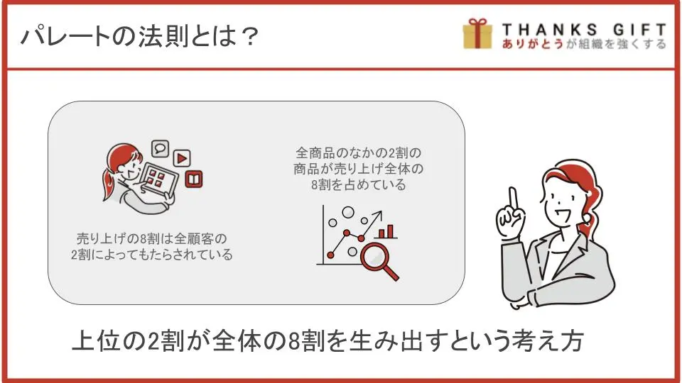 「パレートの法則」は上位の2割が全体の8割を生み出すという考え方で、イタリアの経済学者ヴィルフレド・パレートが提唱しました。