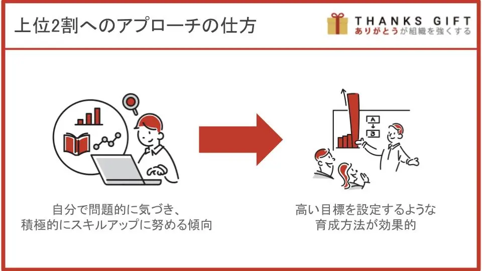 うまく優秀な2割の人材が持つスキルを中位、下位の者に伝えることができれば、組織全体のボトムアップを図ることにもつながります。