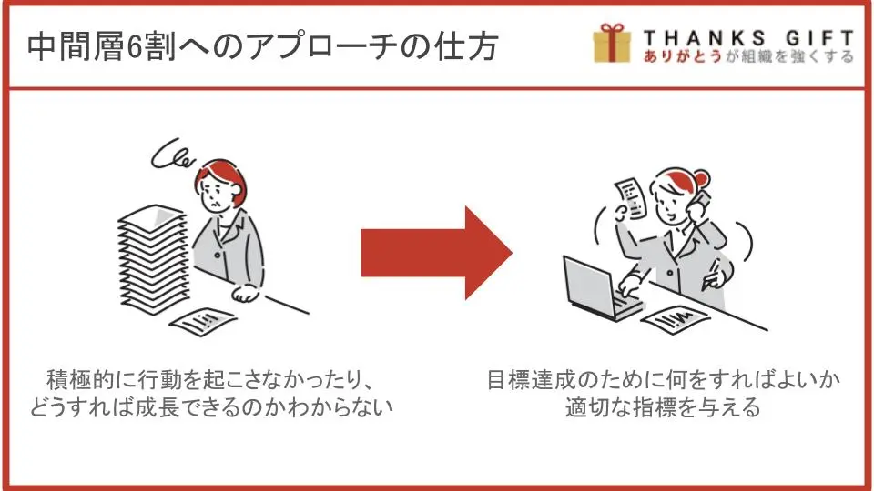 上位2割の人だけに積極的なアプローチをしても、この中間層との間にさらなる差を生むだけで組織全体を引き上げることはできません。