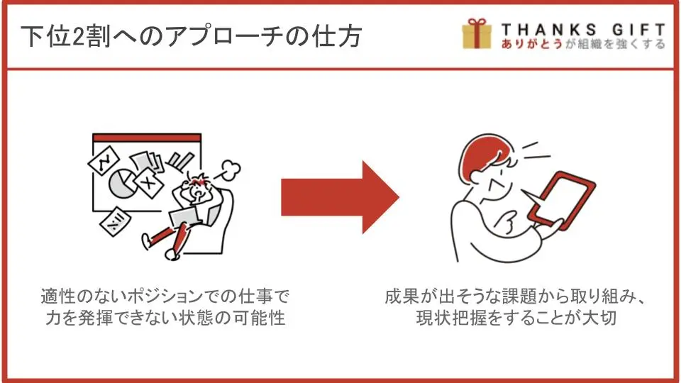 また、下位2割の人のなかには適性のないポジションでの仕事で力を発揮できない状態なのかもしれません。
