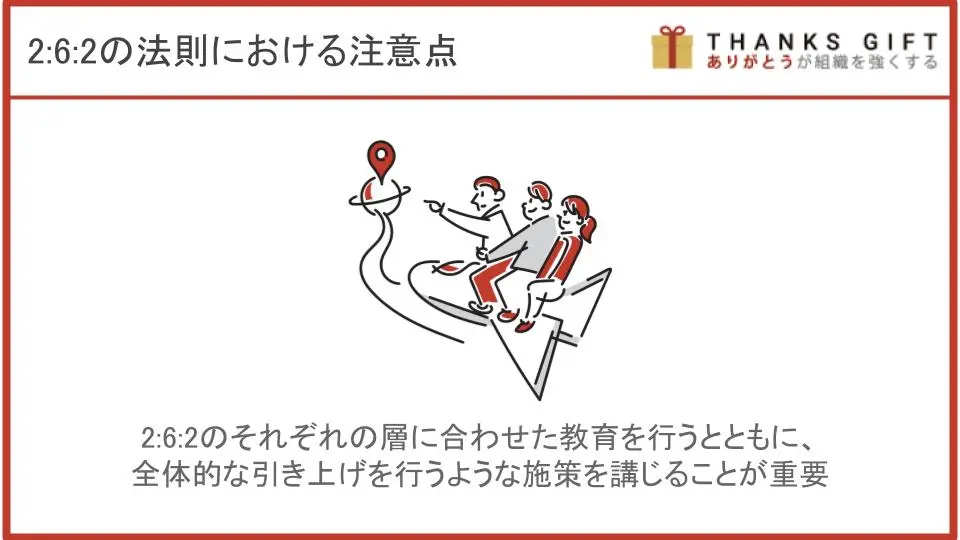2:6:2のそれぞれの層に合わせたマネジメントや教育を行うとともに、全体的な引き上げを行うような施策を講じることが重要です。