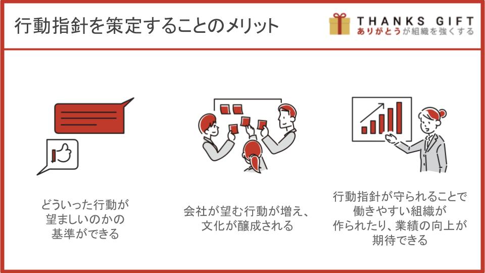 - 行動指針が守られることで働きやすい組織が作られたり、業績の向上が期待できる