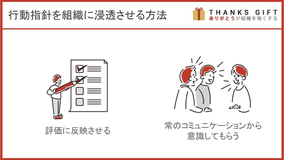 行動指針を組織に浸透させるためには、「評価に反映させる」「日常のコミュニケーションから意識してもらう」などの方法があります。