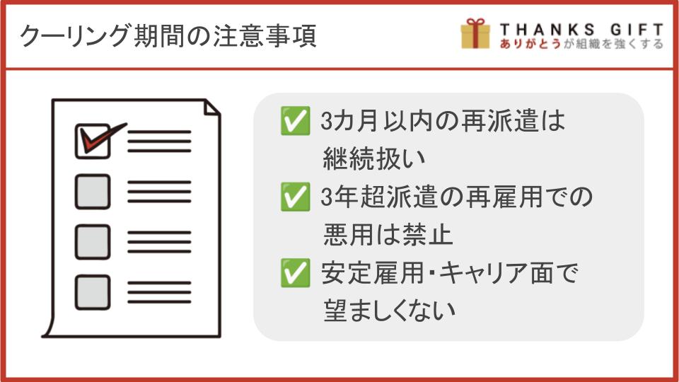 派遣社員の契約から3年経ち、直接雇用や課を変えての延長手続きが面倒だからと、クーリング期間を利用して再雇用するのは避けなければなりません。