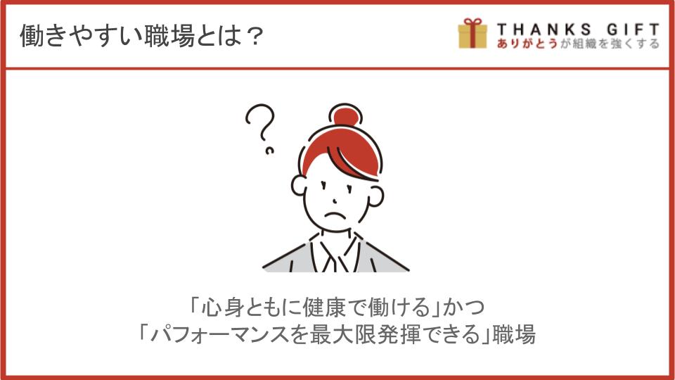 働きやすい職場とは、「心身ともに健康で働ける」かつ「パフォーマンスを最大限発揮できる」職場のことを指します。