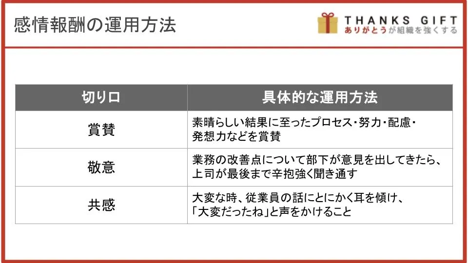 一般的には「賞賛」「敬意」「共感」という3つの切り口でアプローチすることが、従業員の感情報酬を喚起する上で、最も効果的だとされます。