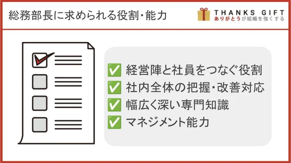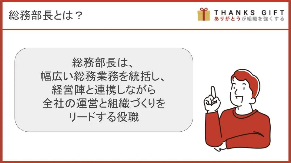 総務部長は、総務部門を統括・管掌する役割を担います。