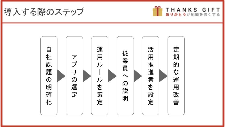 社内ポイントアプリを導入し、全社での利用を定着させるためには以下のステップで進めていきましょう。