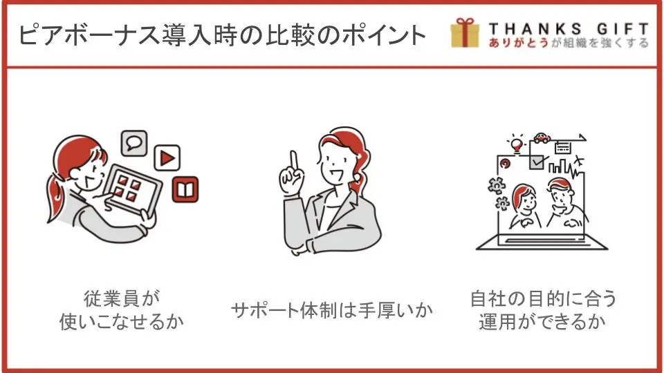例えばピアボーナスツールを導入した場合、社員が活用してくれないといった状況を回避するためにも、従業員がピアボーナスをうまく活用できるようサポートがついているサービスを選定することがおすすめです。