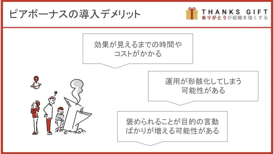 ピアボーナスは成果に反映されにくい言動を評価する仕組みですので、本来一番重要な成果よりもピアボーナスで褒められることが目的になってしまう従業員が出てくる可能性もあります。