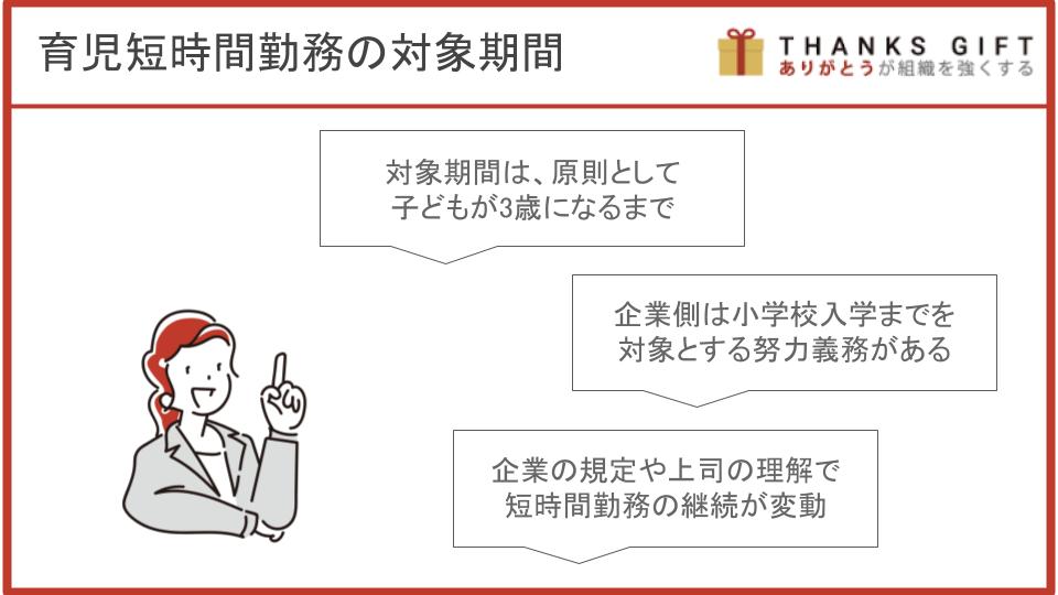 育児短時間勤務の対象期間は、原則として子どもが3歳になるまでとされていますが、企業側には小学校入学まで(6歳になって最初に迎える3月31日まで)を対象とするよう努力することが義務付けられています。