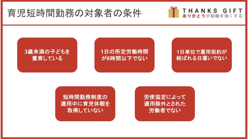 育児短時間勤務の対象者になるには、以下の5つの条件をすべて満たすことが必要です。