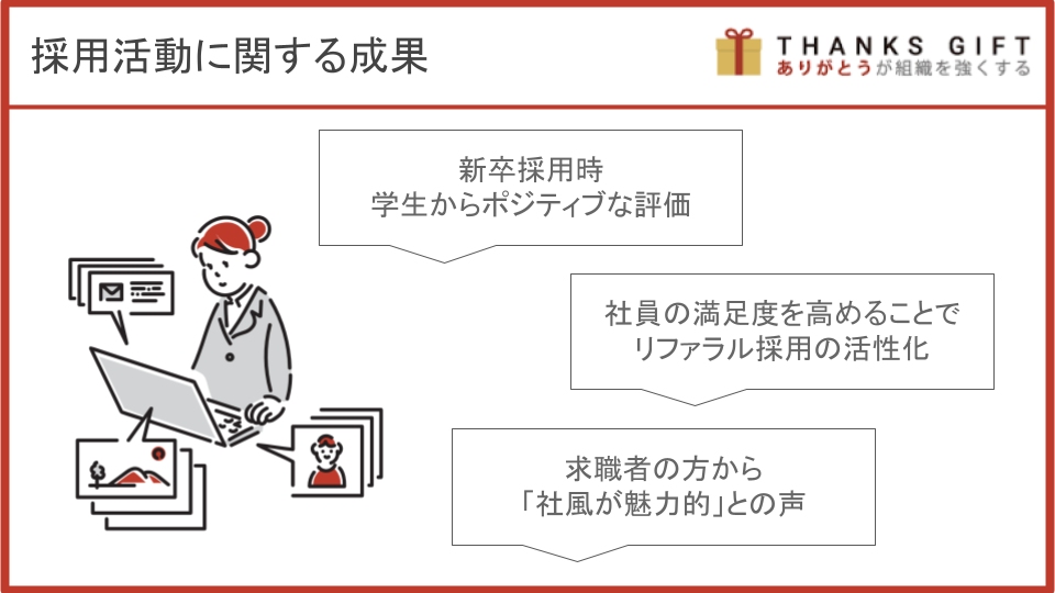 - 求職者の方は、THANKS GIFTを導入していることから良い社風だと思われ、魅力を感じてくださっている方が多い(株式会社ミナミ・エンタープライズ)
