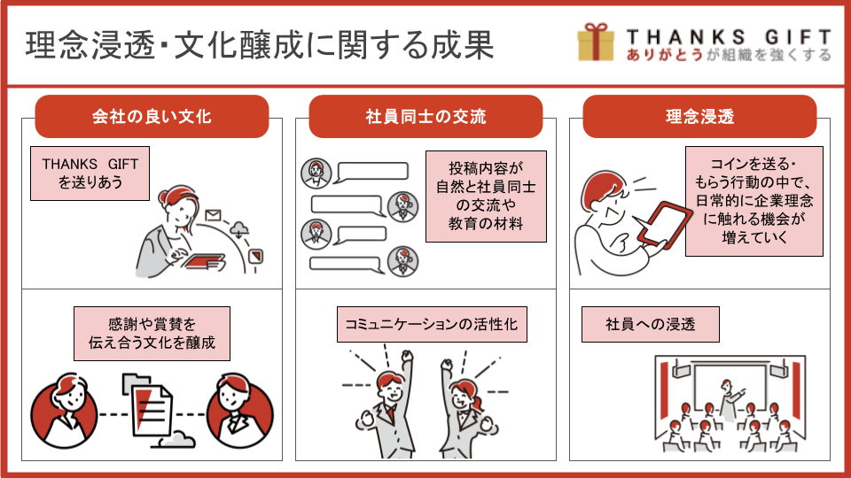 THANKS GIFT(サンクスギフト)は、感謝を贈り合うことで社内コミュニケーションを活性化させ、社内文化を醸成でき組織や社内の生産性向上、エンゲージメント向上に寄与するツールです。