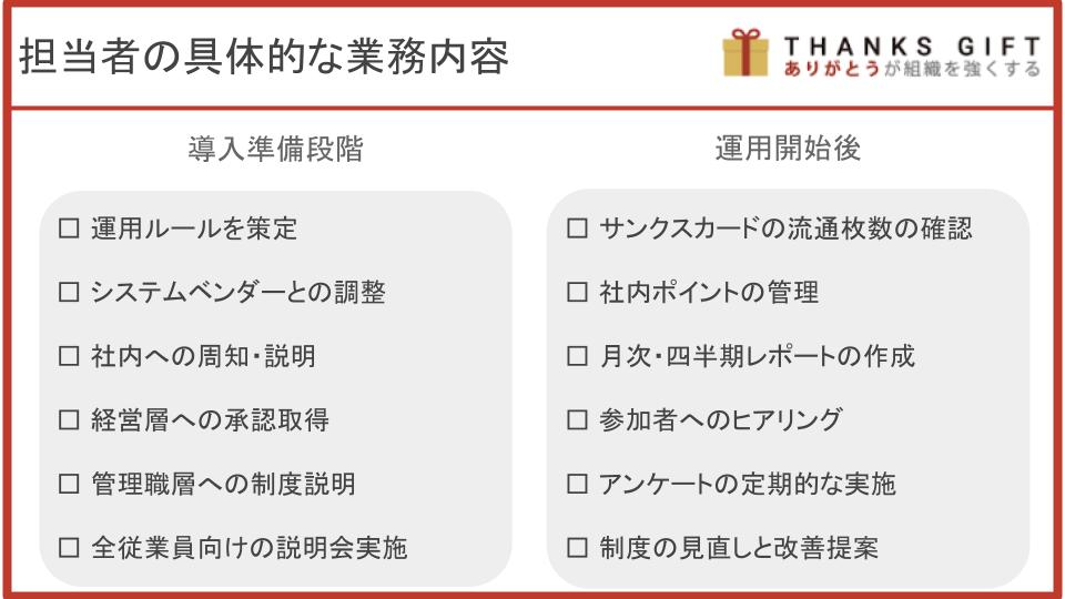 サンクスカード制度の成否は、運用を担当する人材の選定と、その担当者の取り組み方に大きく左右されます。