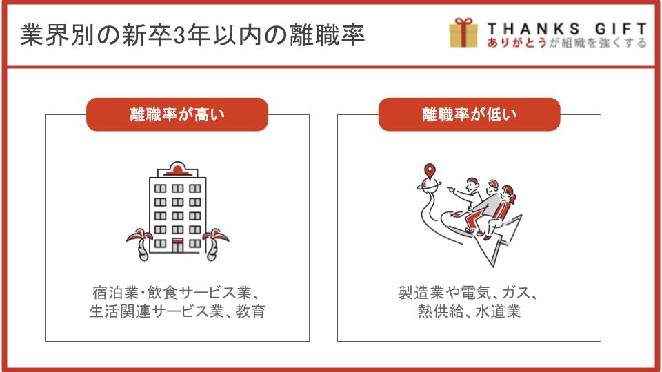 一方で、製造業や電気、ガス、熱供給、水道業は、新卒3年以内の離職率が20%を切っており、離職率が低くなっています。