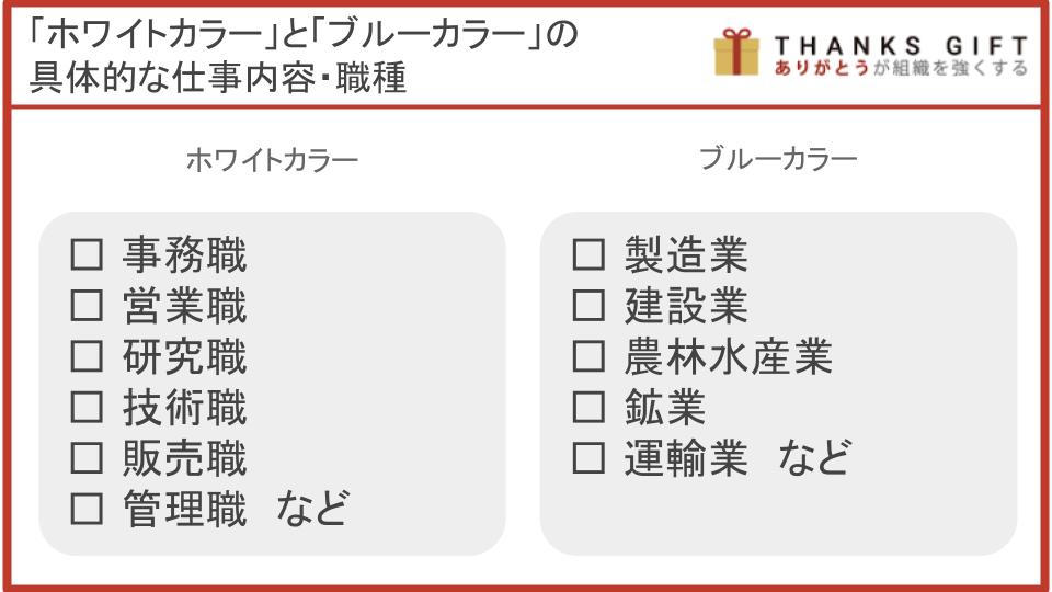 ブルーカラーの多い製造業などの業種で働いていても、営業職や経理担当者、管理職などはホワイトカラーに分類されます。
