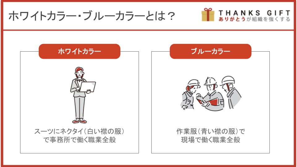 対して、青い襟とは作業服のことでブルーカラーとは、作業服を着て現場で生産に携わる職業全般を指します。