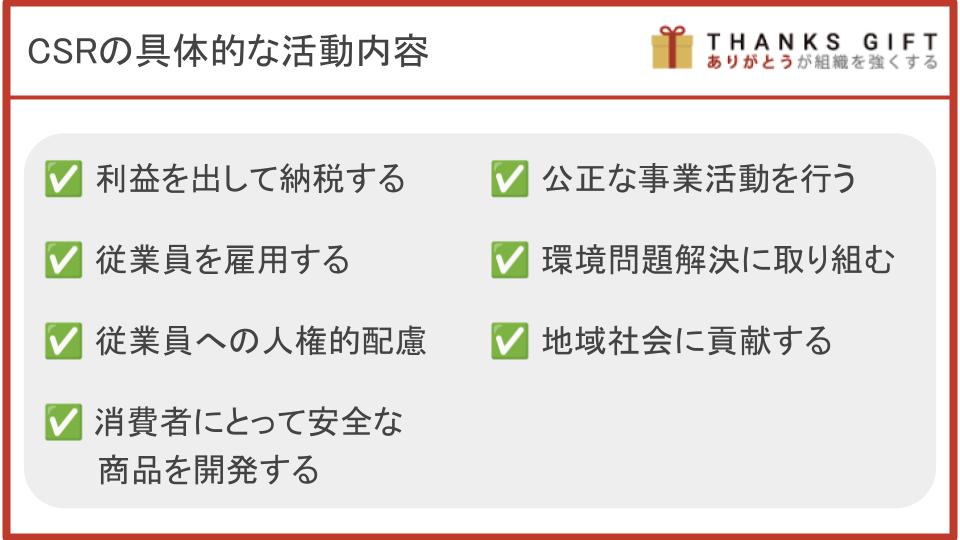 企業としてCSRに取り組む内容として具体的には下記のようなものがあります。