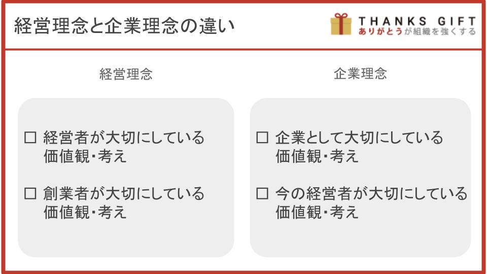 経営者が数代目である場合は、創業者が大切にしている価値観・考えが「企業理念」、今の経営者が大切にしている価値観・考えが「経営理念」としている企業もあり、一方で現経営者が創業者である場合は、企業理念=経営理念としている企業もあります。