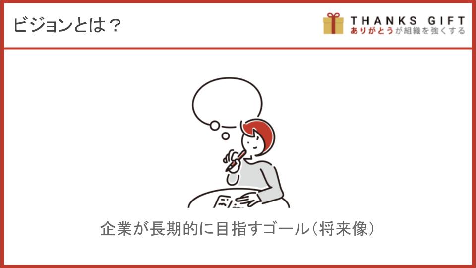 - ビジョン:その企業の長期的に目指すゴール(将来像)