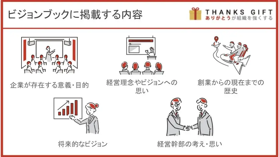 ビジョンブックは企業によって掲載内容が異なりますが、一般的に次の要素で構成されています。