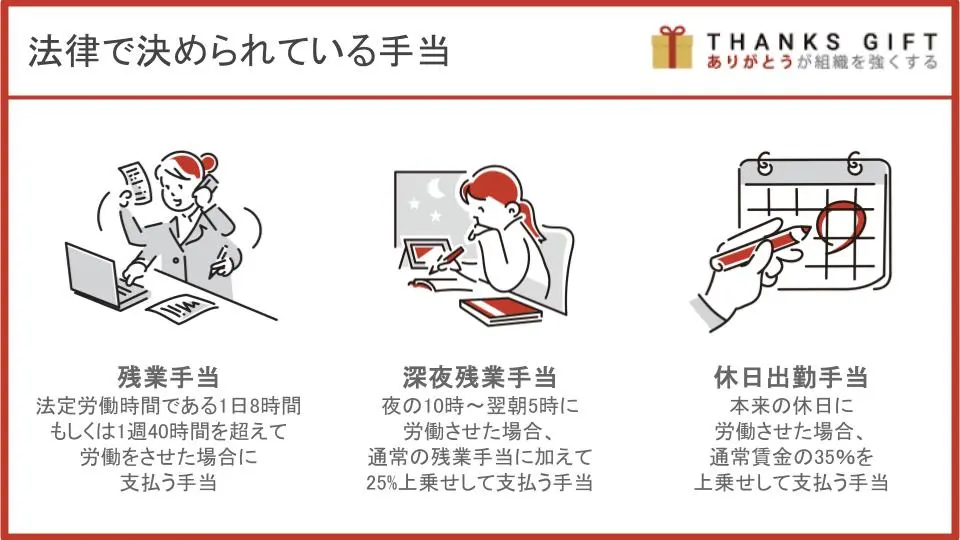 労働基準法では「残業手当」と「深夜残業手当」、さらに「休日出勤手当」については必ずつけることを義務づけています。