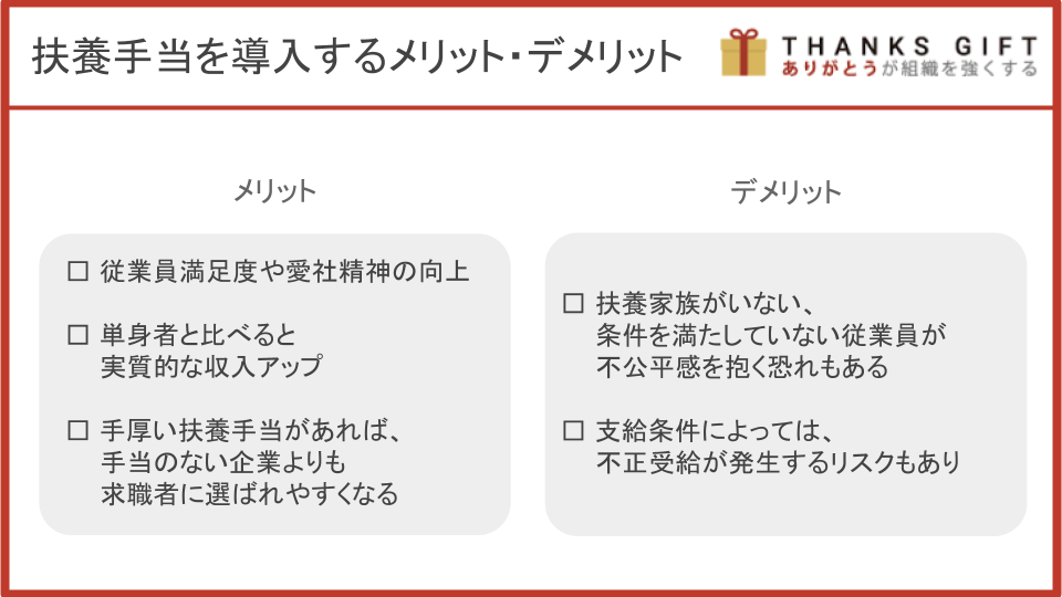 扶養家族がいない、または条件を満たしていない従業員が不公平感を抱き、企業内の雰囲気悪化やモチベーションの低下を招く恐れもあるでしょう。