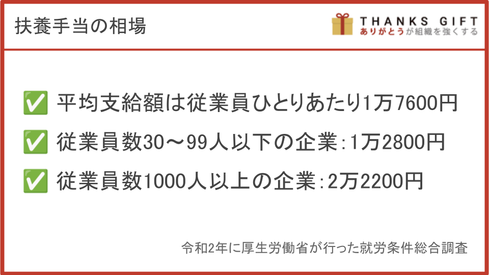 令和2年に厚生労働省が行った就労条件総合調査によると、扶養手当や家族手当、育児支援手当などの平均支給額は従業員ひとりあたり1万7600円でした。