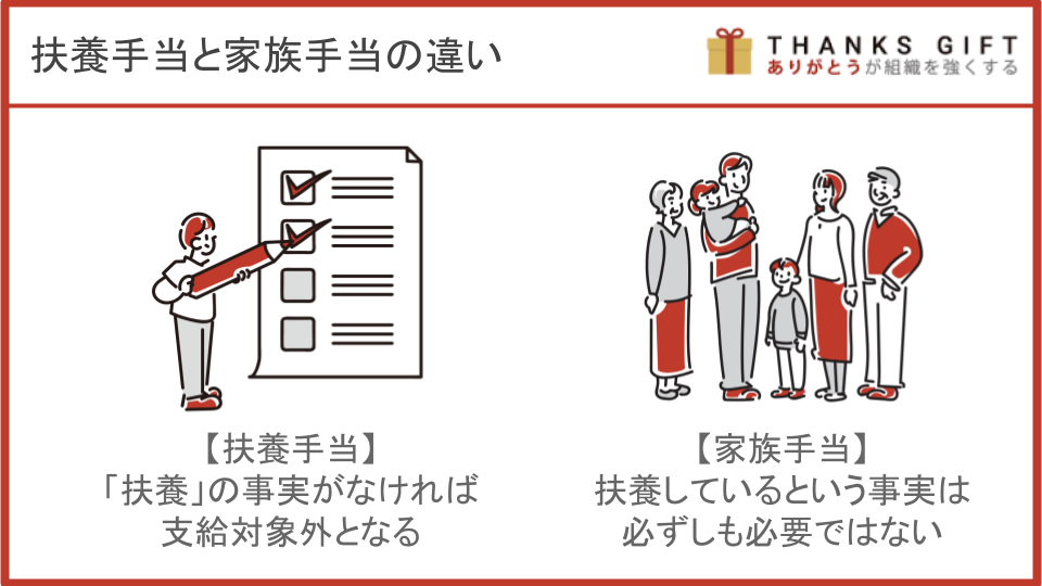 これに対し、家族手当は家族の有無や構成を判断基準にしており、扶養しているという事実は必ずしも必要ありません。