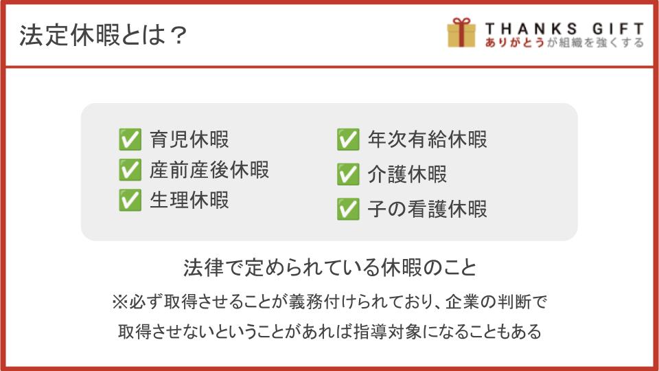 法定休暇は育児休暇や産前産後休暇、生理休暇や年次有給休暇、介護休暇、子の看護休暇などがあげられます。