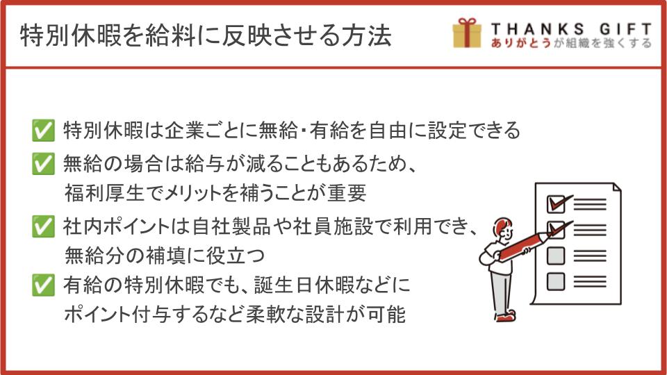 また、有給とする特別休暇の場合も、誕生日休暇やアニバーサリー休暇などは福利厚生としてポイントを付与するという方法もあります。