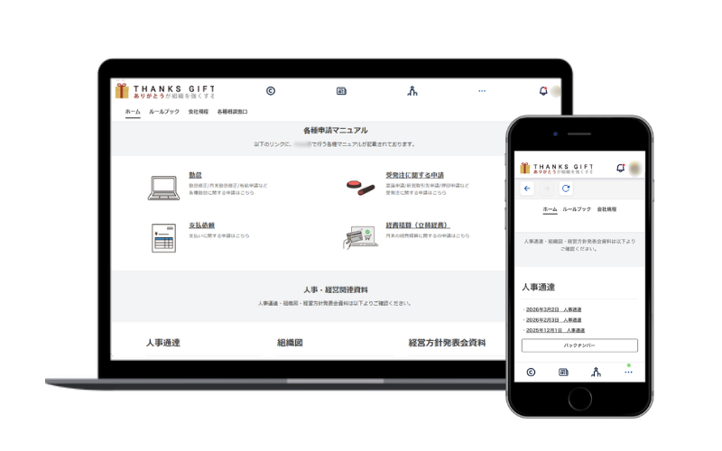 社内ルールやマニュアル、経営メッセージをTHANKS GIFTに集約することで、全従業員が使いやすく、迅速に情報が届くプラットフォームに。